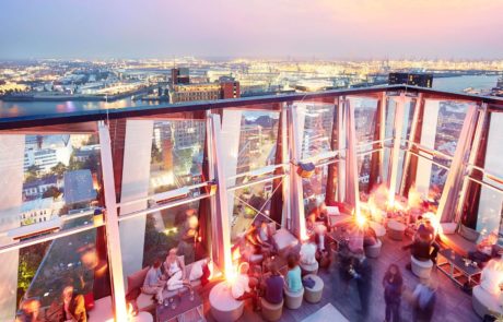 Die 235m² große rundum verglaste Dachterrasse clouds heaven’s nest mit Outdoor-Lounges, Daybeds und einer eigenen Rooftop-Bar, bietet bei gutem Wetter die Möglichkeit, Hamburg von oben zu entdecken. Der Panoramablick reicht südlich weit über die Elbe, den Hamburger Hafen, Spielbudenplatz, Reeperbahn und den Michel.