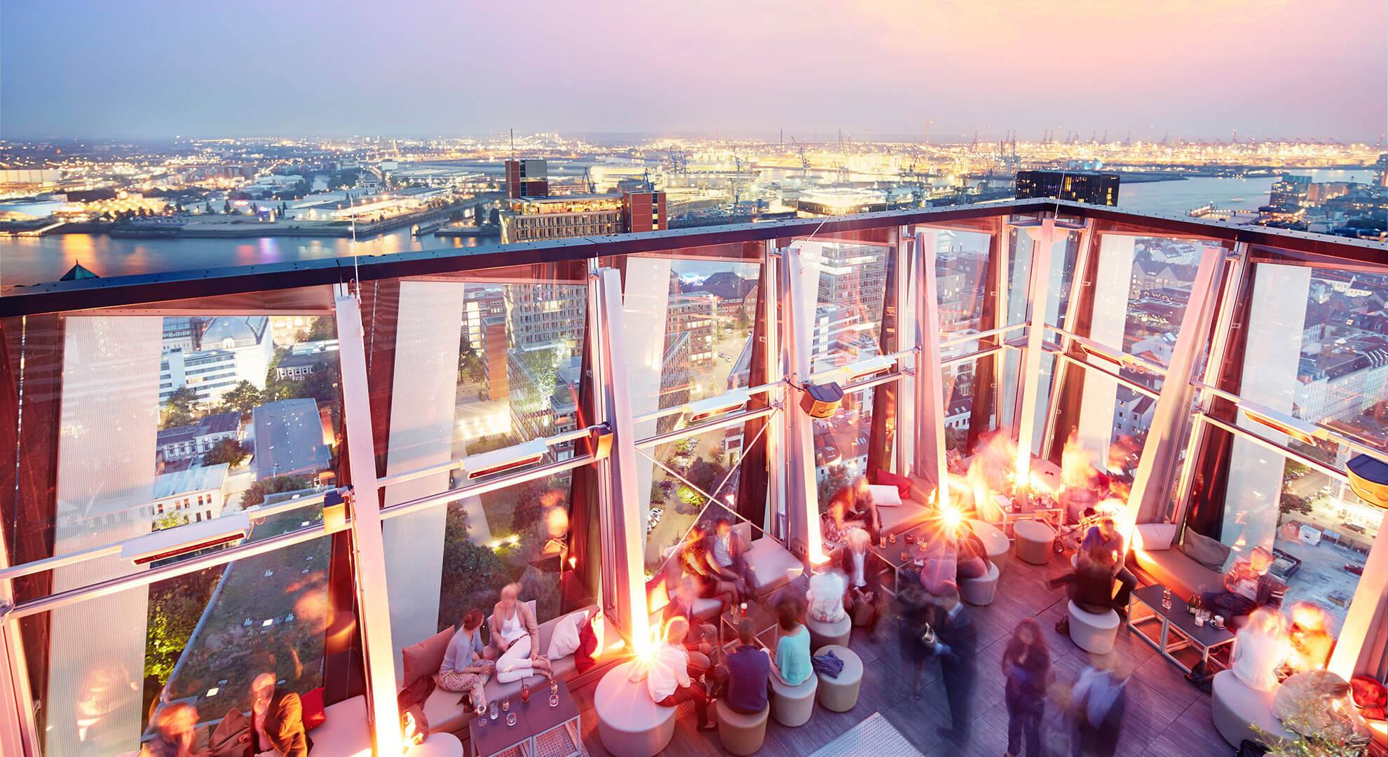 Die 235m² große rundum verglaste Dachterrasse „Elb Rooftop“ mit Outdoor-Lounges, Daybeds und einer eigenen Bar, bietet bei gutem Wetter die Möglichkeit, Hamburg von oben zu entdecken. Der Panoramablick reicht südlich weit über die Elbe, den Hamburger Hafen, Spielbudenplatz, Reeperbahn und den Michel.