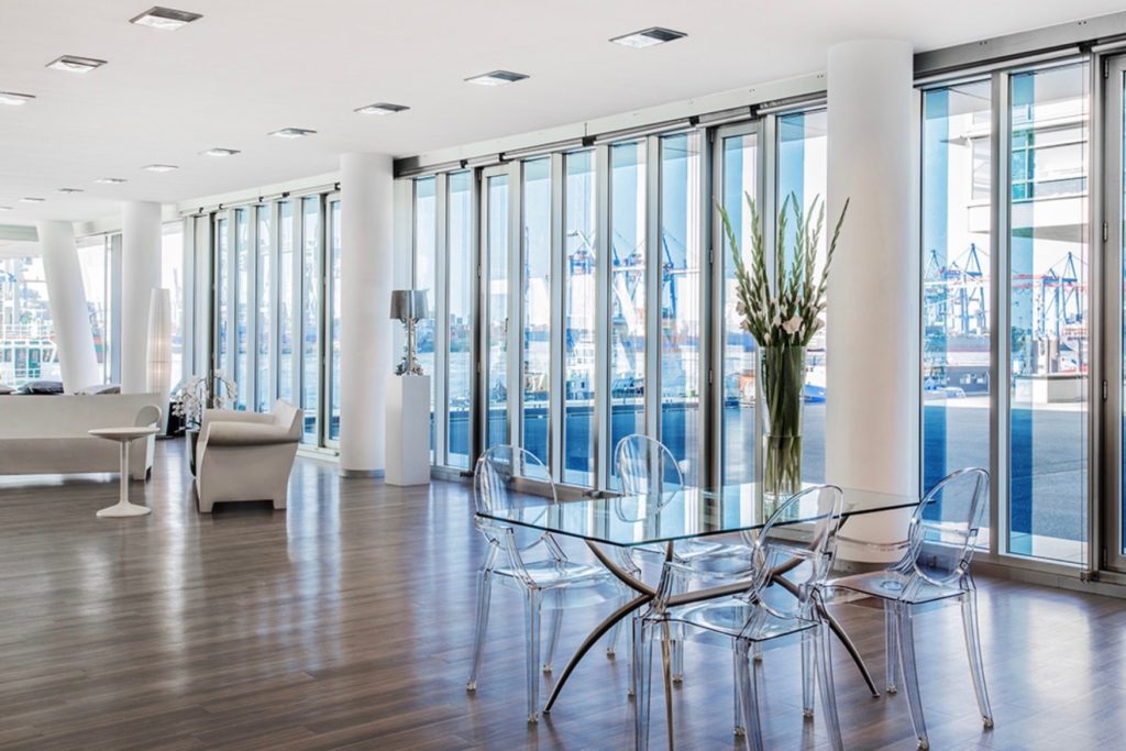 Durch die raumhohe Verglasung in drei Himmelsrichtungen ist die 270 qm große Location lichtdurchflutet und präsentiert sich in einem großzügigen und modernen Ambiente. Der direkte freie Blick ist einzigartig und vermittelt das Gefühl, man stünde auf einer Schiffsbrücke inmitten des Hamburger Container Hafens. Die ca 500 qm große Außenfläche bietet sich an als Präsentationsfläche für PKWs, größere Produktpräsentationen oder als Fläche für den Aufbau eines Zeltes für Hochzeits Zeremonien oder als Party-Zelt. Das attraktive Bauwerk erhielt im Jahr 2003 als einziges Hamburger Gebäude eine offizielle Anerkennung im Rahmen der Preisverleihung des deutschen Architekturpreises in Berlin.