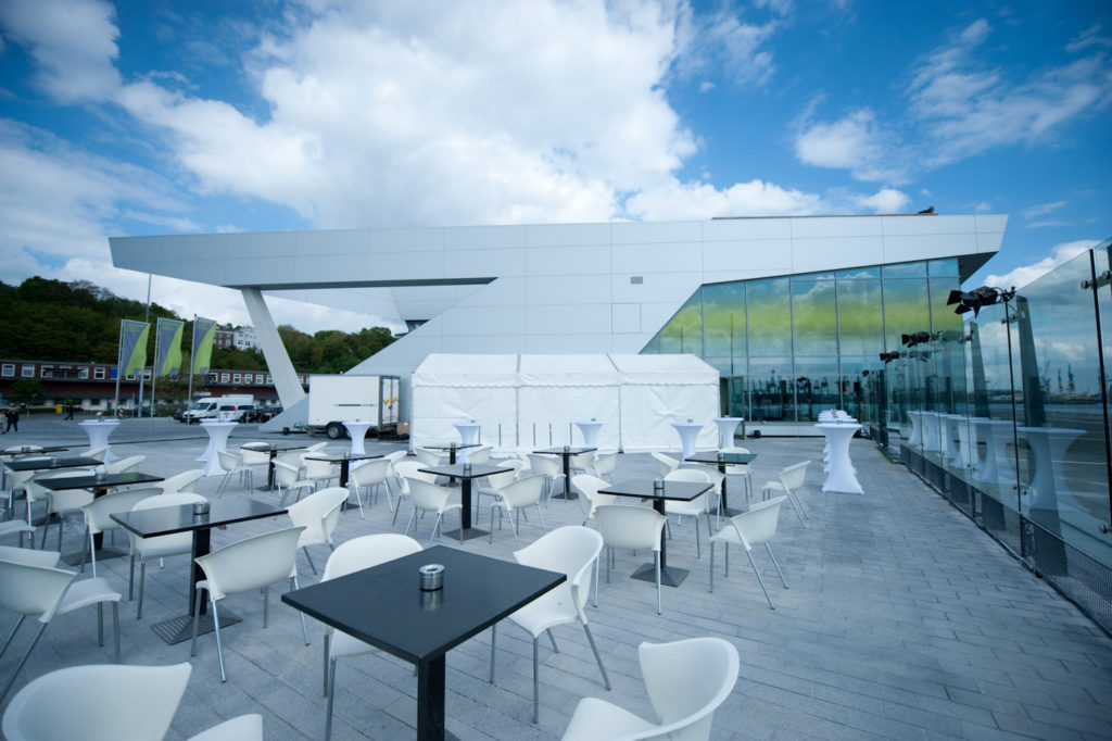 Schon von außen beeindruckt die 1.300qm reine Veranstaltungsfläche mit ihrer Architektur. Die vollständige verglaste Außenfläche bietet einen fantastischen und exklusiven Blick über die Elbe und den dahinterliegenden Hafen. Ein ganz besonderes Highlight ist die herrliche Aussicht auf die vorbeifahrenden Schiffe.